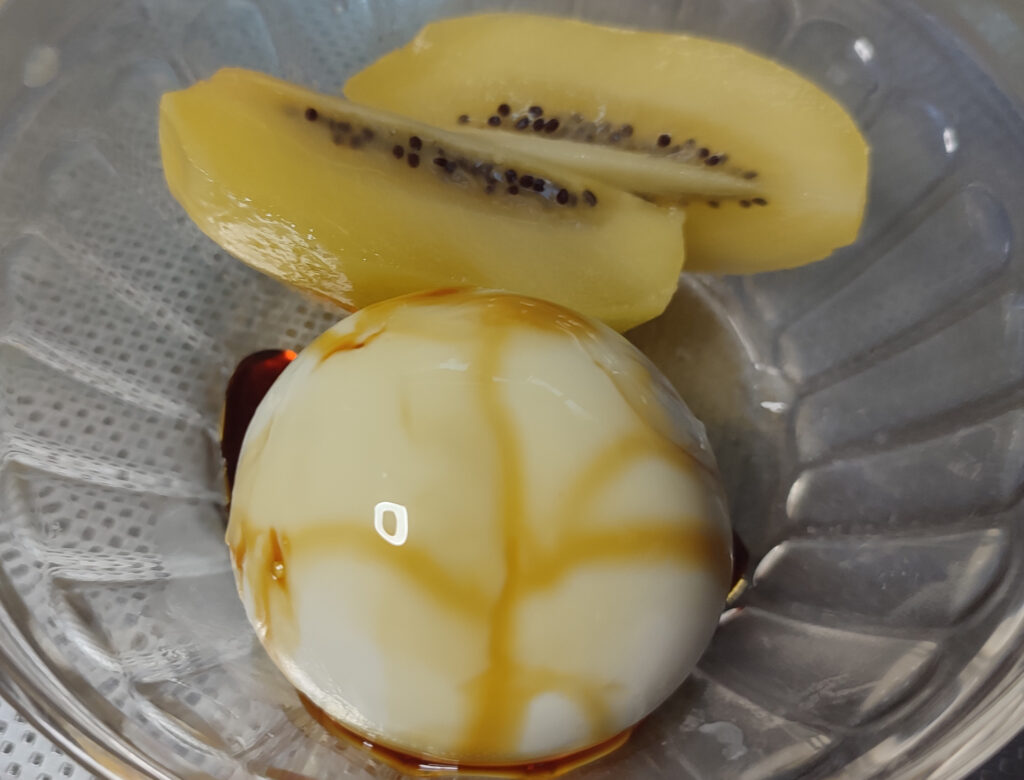 ゴールドキウイが有ったので一緒に食べてみました。カラメルは少し苦みがあると大人の味でミルクプリンの甘さと相まってとても美味しかったです!
